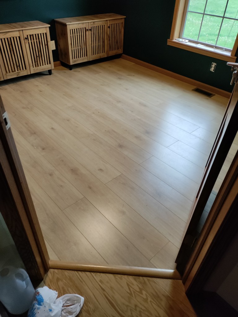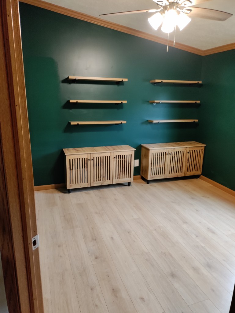 Room paint and remodel (incl. flooring, furniture, and shelving build):